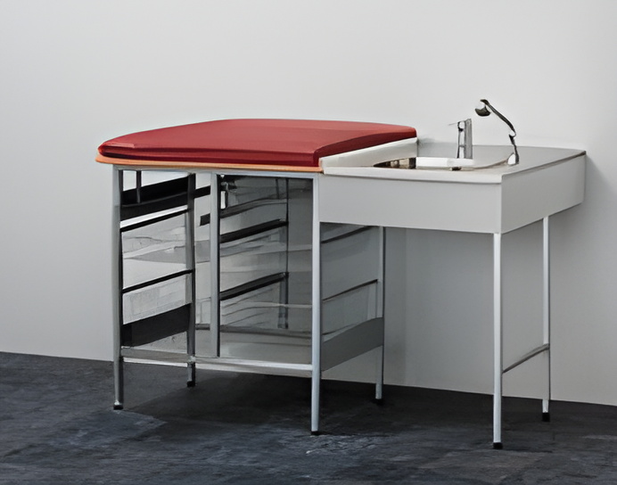 Skötbord med 6 st trådkorgar och tvättbänk höger